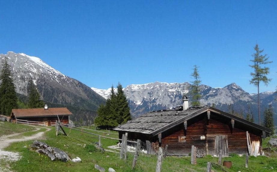 Von der sehr schön gelegenen Stubenalm unterhalb des Watzmannhauses hat man ein prächtiges Panorama von der Reiteralpe bis zum Hochschwarzeck.