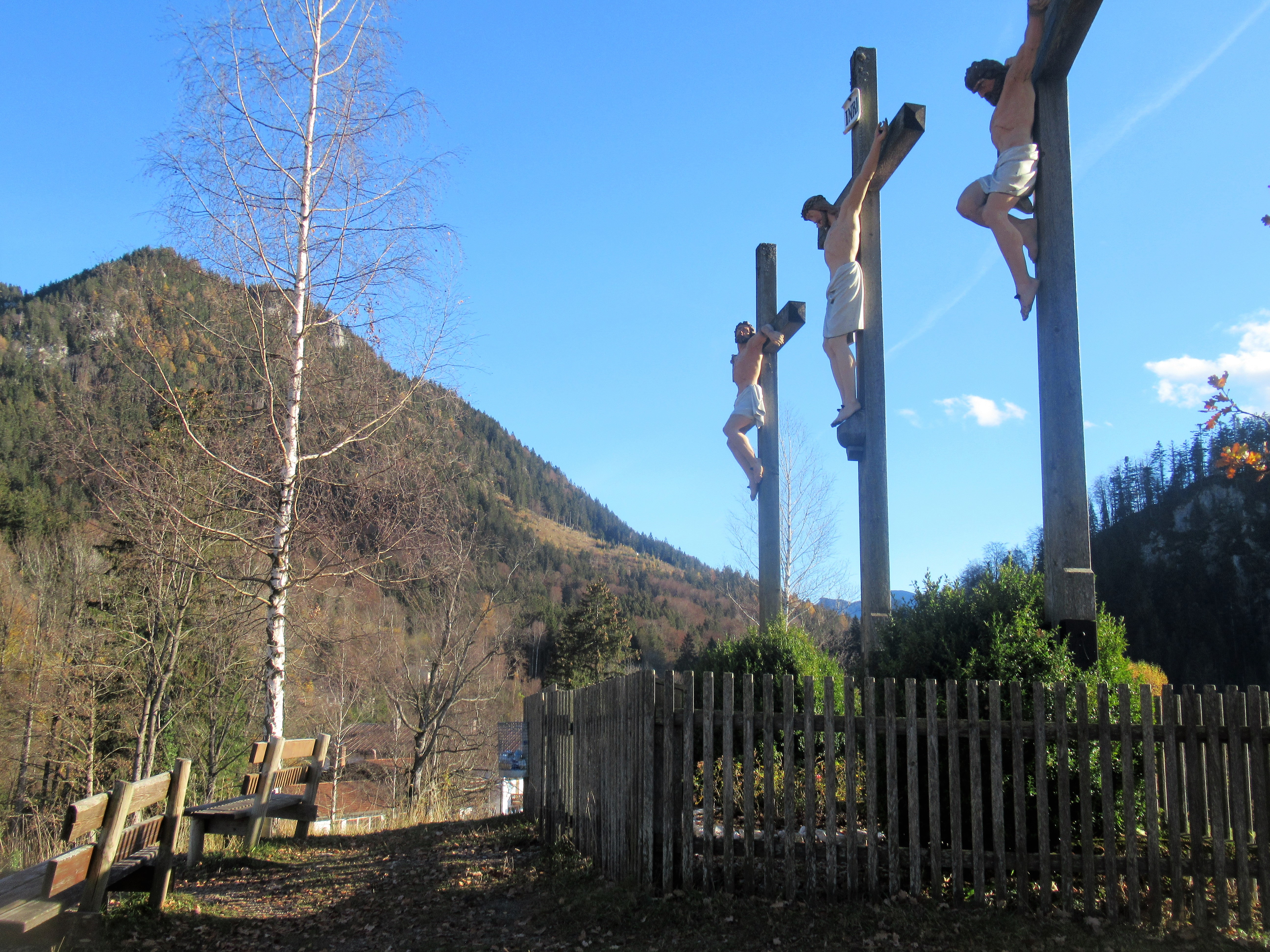 Gegenüber der Wallfahrtskapelle steht auf einem Hügel, dem Kalvarienberg, eine Kreuzigungsgruppe.