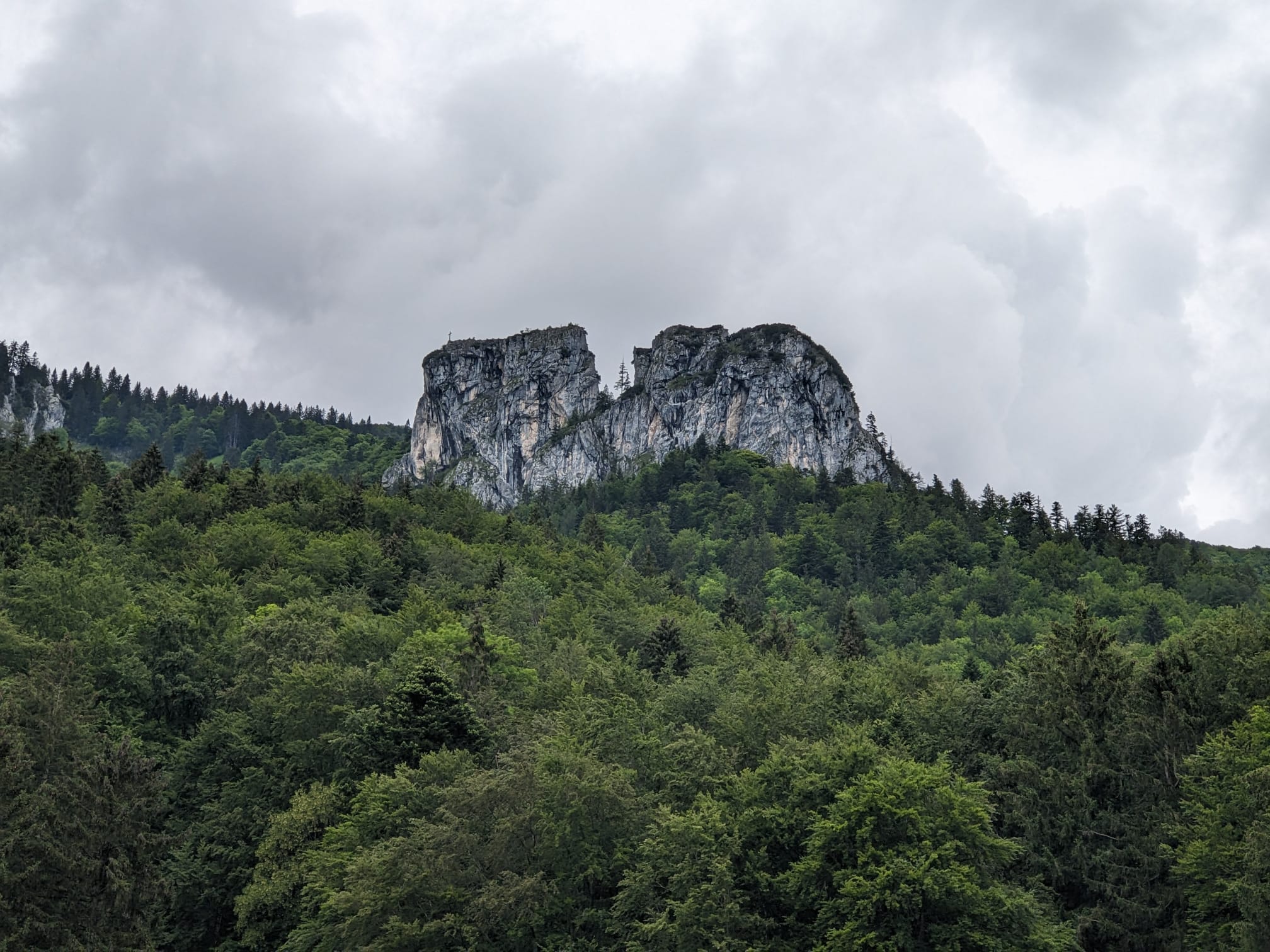 Von der Huberalm aus folgen wir einem schmalen Pfad, der uns zu einer Forststraße führt. Wir biegen nach rechts ab und nach etwa 200 Metern nach links, wo wir der Markierung in Richtung Hochplatte folgen. Der Aufstieg erfolgt auf einem schmalen, teils holprigen Steig durch unwegsames Gelände mit zahlreichen Wurzeln. Unterhalb der beeindruckenden Zwillingswand und des markanten Teufelsteins wird der Weg stellenweise recht steil, bevor wir eine Wegkreuzung erreichen.