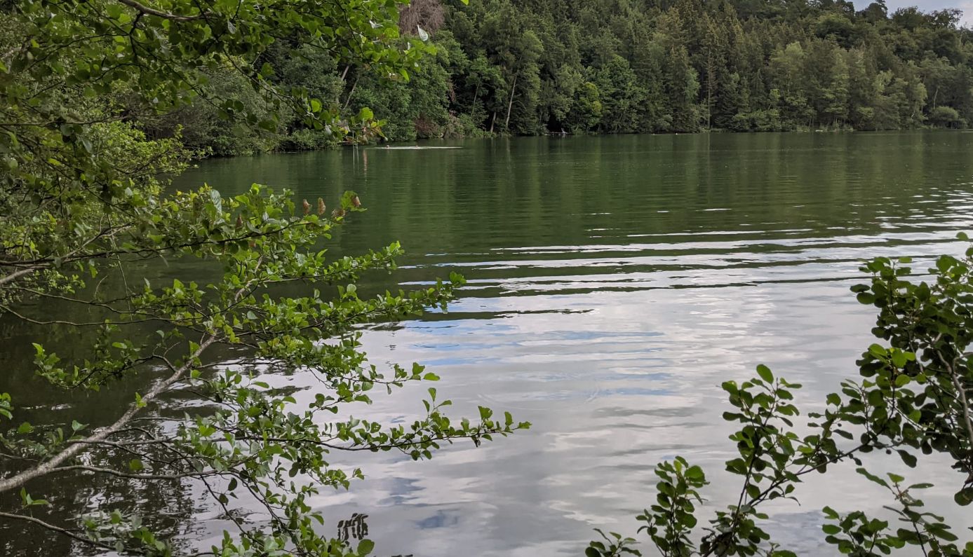 Ein breiter und flacher Weg führt nah am Ufer entlang rund um den See.