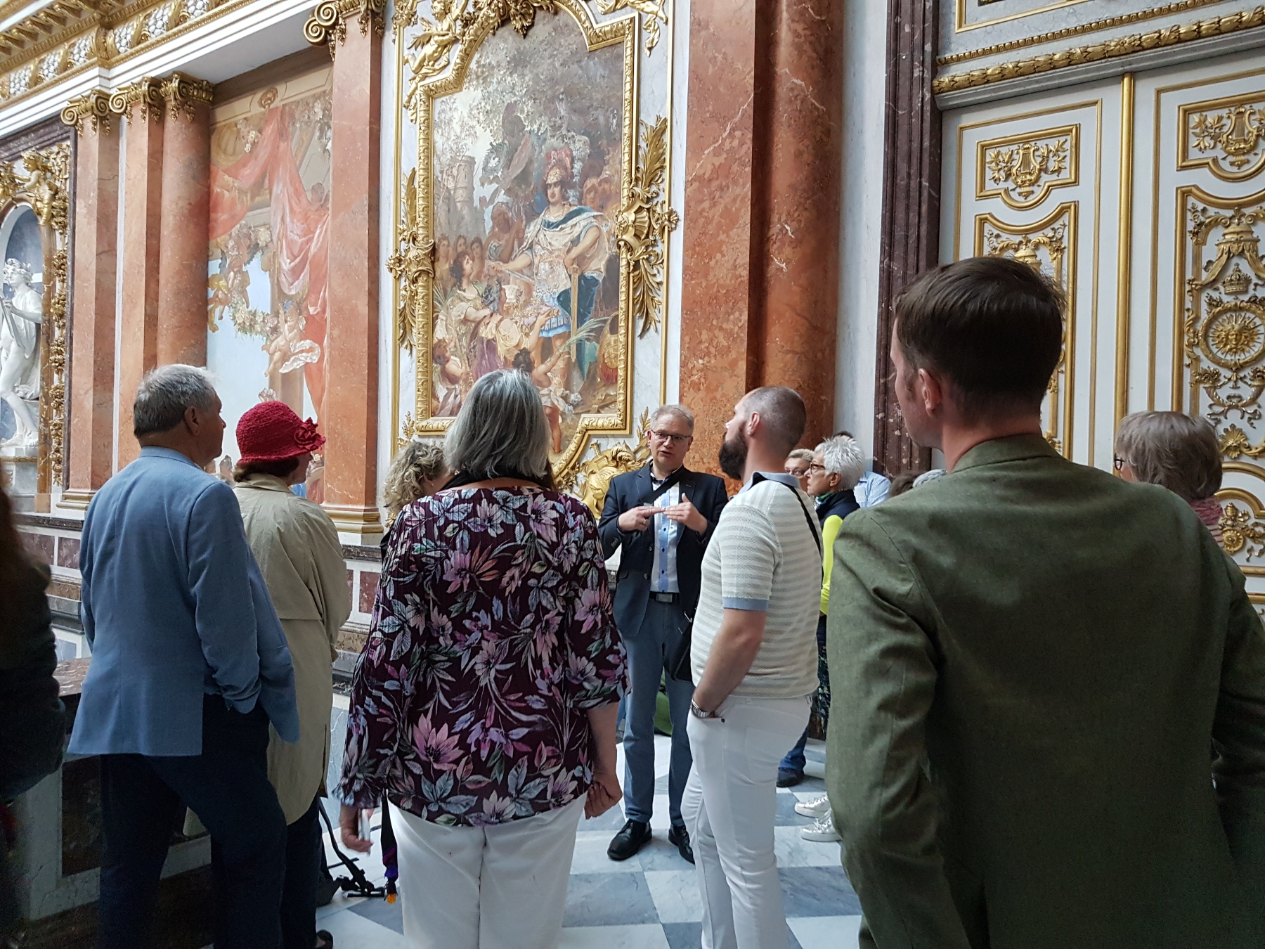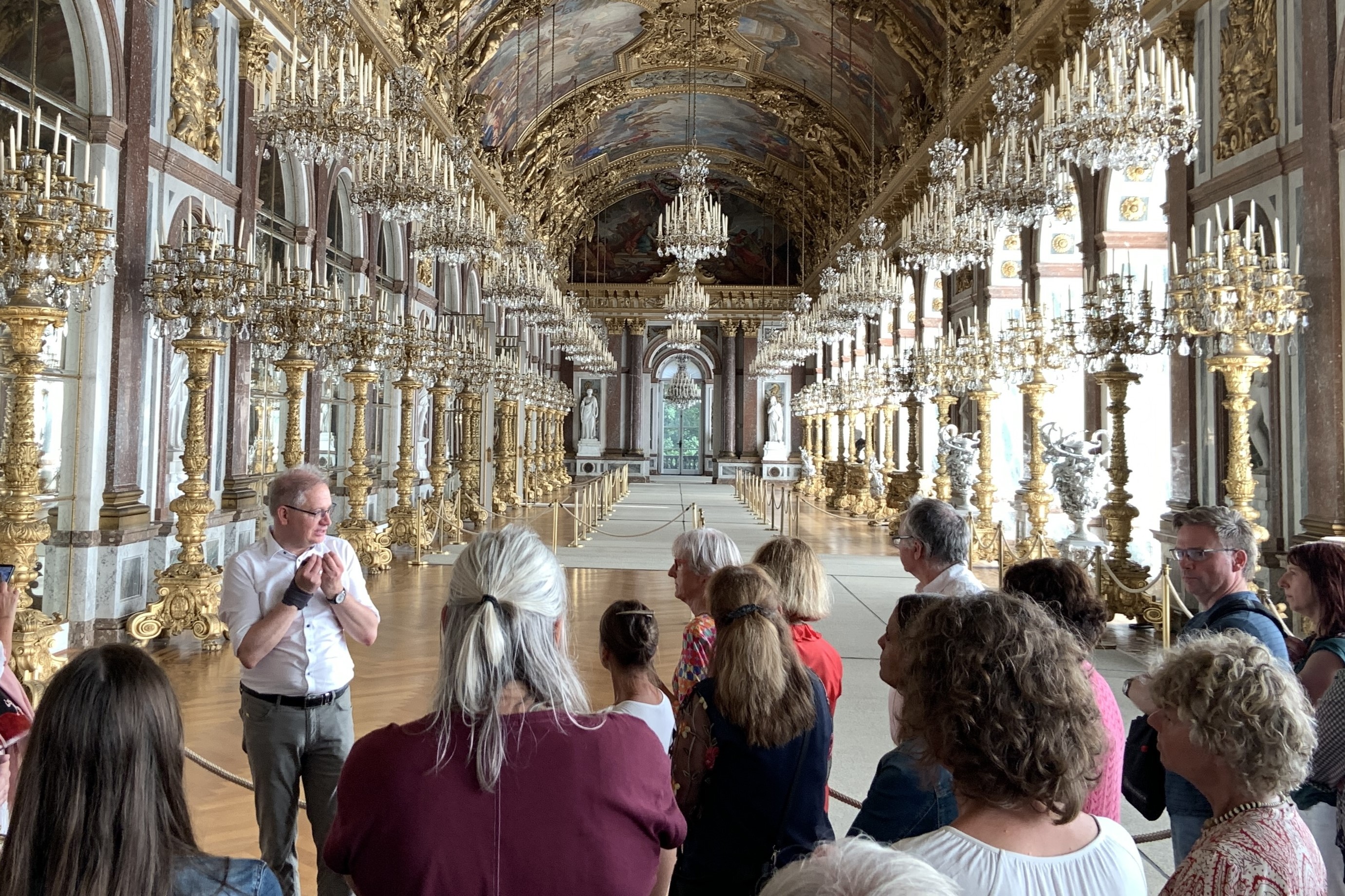Endlich hatten zahlreiche Besucher:innen wieder die Möglichkeit, exklusiv im Schloss Herrenchiemsee auf den Spuren von König Ludwig II. zu wandeln. Nach zweijähriger coronabedingter Pause lud die Bücherei Prien am 4. August 2022 zu „Sonnenkönig und Schneerahmtörtchen“. Wie bei den vorangegangenen Veranstaltungen seit 2013 gewann die Bücherei Prien hierfür den renommierten Ludwig-II.-Biografen und -Experten Marcus Spangenberg. Der Historiker führte die Teilnehmenden mit seinem breiten Wissen über die Vita des Königs und die Schlossanlage von Herrenchiemsee unterhaltsam durch den Abend. „Es freut mich überaus, dass in diesem Jahr wieder Besucher aus ganz Deutschland bei uns zu Gast sind“, begrüßte Spangenberg die Gäste. Dass manche der Ludwig- und Schloss-Interessenten wiederholt dem besonderen Ereignis „Sonnenkönig und Schneerahmtörtchen“ beiwohnten, war für den Historiker eine besondere Auszeichnung. Viele der knapp 50 Gäste hatten ihre Teilnahmekarten bereits für 2020 erworben und fieberten seitdem diesem Abend entgegen. Und das Warten hatte sich definitiv gelohnt.