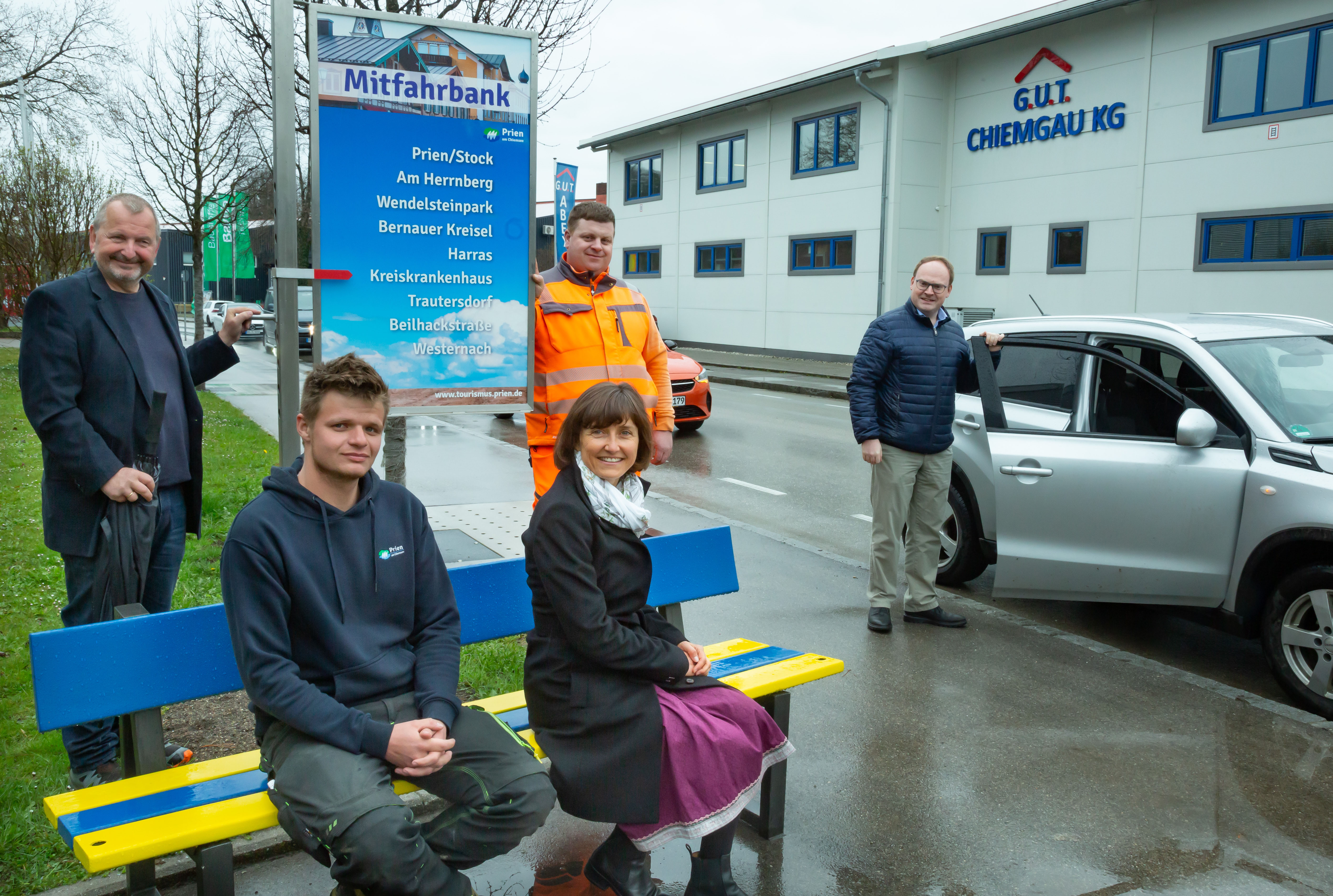 Am runden Tisch Verkehr – ein beratendes Gremium, welches einstimmig vom Marktgemeinderat berufen wurde – werden Ideen entwickelt, um die Verkehrssituation in Prien zu verbessern. Nach Auffassung der Mitglieder besteht Handlungsbedarf, was die Erreichbarkeit von Zielen innerhalb des Ortszentrums betrifft. Auch eine Attraktivitätssteigerung des ÖPNV mit erhöhter Taktfrequenz sei in absehbarer Zeit nicht zu erwarten. Seit Anfang April 2022 stehen auf Initiative der ehemaligen Priener Marktgemeinderätin Marie-Luise Ganter zehn „Mitfahrbankerl“ in der Seegemeinde. Die praktischen Arbeiten wurden in Zusammenarbeit von den Mitarbeiter:innen der Gärtnerei und der Marketingabteilung der Prien Marketing GmbH (PriMa), von den Mitarbeitern des gemeindlichen Bauhofs und den ehrenamtlichen Helfern der „Bürgerwerkstatt Prien“ realisiert. Bei den Bänken handelt es sich um gelb-blau gestrichene Exemplare, für deren Farbgebung die Wappenfarben der Marktgemeinde maßgebend waren. An den seitlich angebrachten Schildern sind jeweils neun Zielorte aufgeführt, sodass Wartende mit einem verstellbaren Pfeil den Autofahrern anzeigen können, wohin sie wollen. Aufgestellt wurden die Mitfahrbänke in Prien/Stock, am Herrenberg, Wendelsteinpark, Bernauer Kreisel sowie in Harras, am Kreiskrankenhaus, in Trautersdorf, in der Beilhackstraße, in Westernach und am Gewerbepark in der Hochriesstraße. Der Referent für Soziales und Dritte Bürgermeister der Marktgemeinde Martin Aufenanger erhofft sich mit dem neuen Projekt Mobilitätslücken zu schließen und Abhilfe zu schaffen, damit gerade Menschen ohne Auto zu mehr Mobilität verholfen wird. Ziel sei es, vor allem ältere Menschen und Jugendliche (bei Minderjährigen liegt es im Ermessen der Eltern, ab welchem Alter das Angebot genutzt werden darf) zu unterstützen. „Wir sind der festen Überzeugung, dass das ‚Priener Mitfahrbankerl‘ das Zusammenleben im Ort fördert und ein Zeichen für mehr Miteinander setzt“, so der Erste Bürgermeister der Marktgemeinde Andreas Friedrich. Ein weiterer wichtiger Punkt ist das Thema Umwelt‐ und Klimaschutz - die Initiatoren hoffen weitere Mitbürger:innen für das „Priener Mitfahrbankerl“ zu begeistern, um der stetig zunehmenden Verkehrsbelastung im Ort entgegenzuwirken. Bei guter Annahme ließe sich das Angebot auch weiter ausbauen, heißt es von Seiten der Gemeinde.