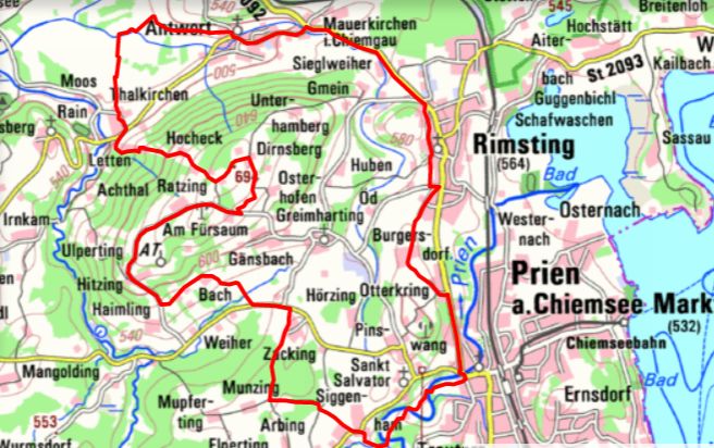Prien – Eichental – Siggenham – Munzinger Straße – Zacking – Hitzing – Ratzing – Berggasthof Weingarten – Dirnsberg – Stauden/Thalkirchen – Antwort – Mauerkirchen – Rimsting – Otterkring – Prien