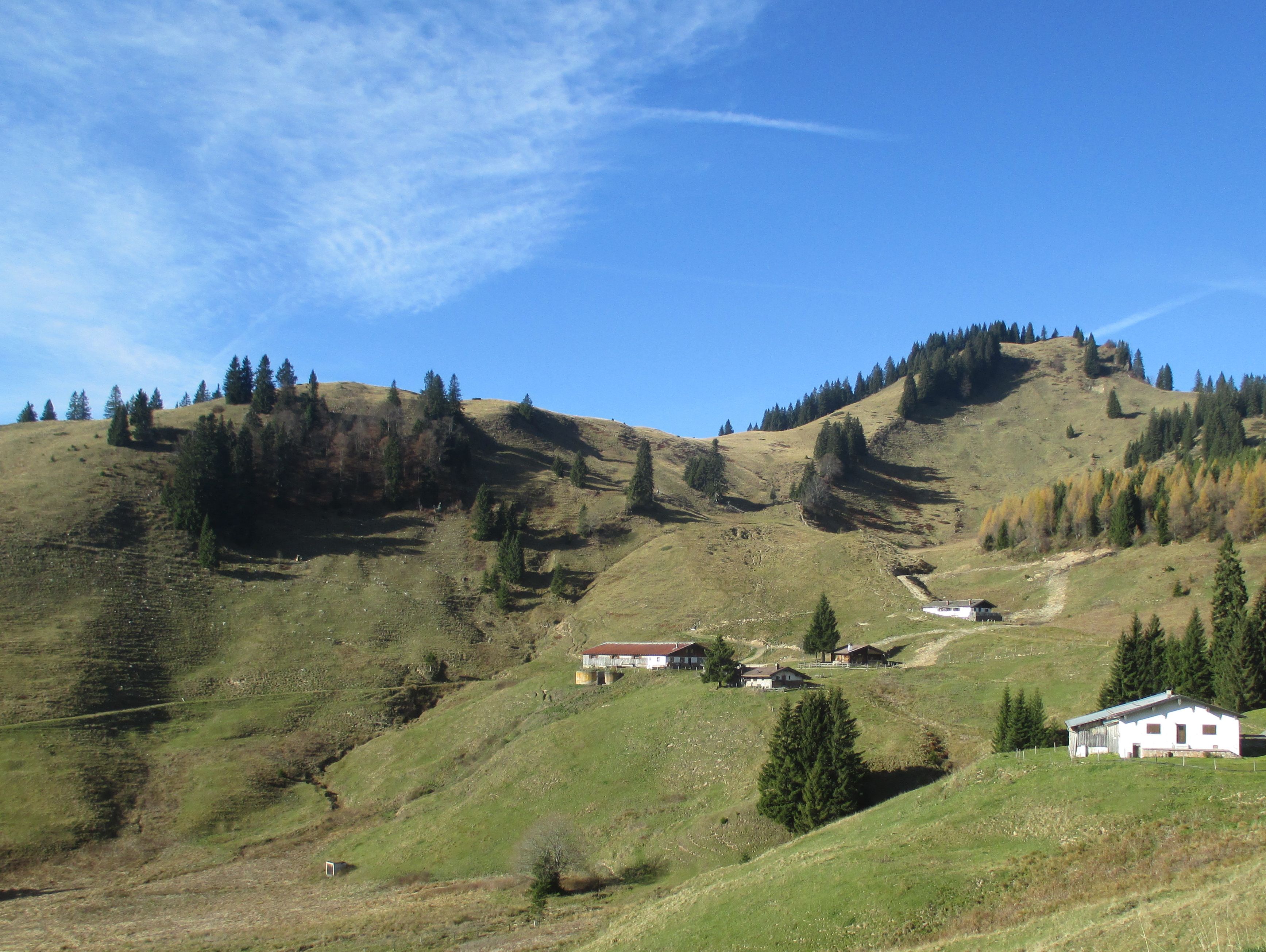 Bei der bewirtschafteten Naringalm (1136 m) kann man sehr schön auf der Terrasse die schöne Aussicht genießen, bevor man dem Wegweiser nach „Kössen über die Hinhagalm“ folgend zum Ausgangspunkt nach Staffen hinabwandert.